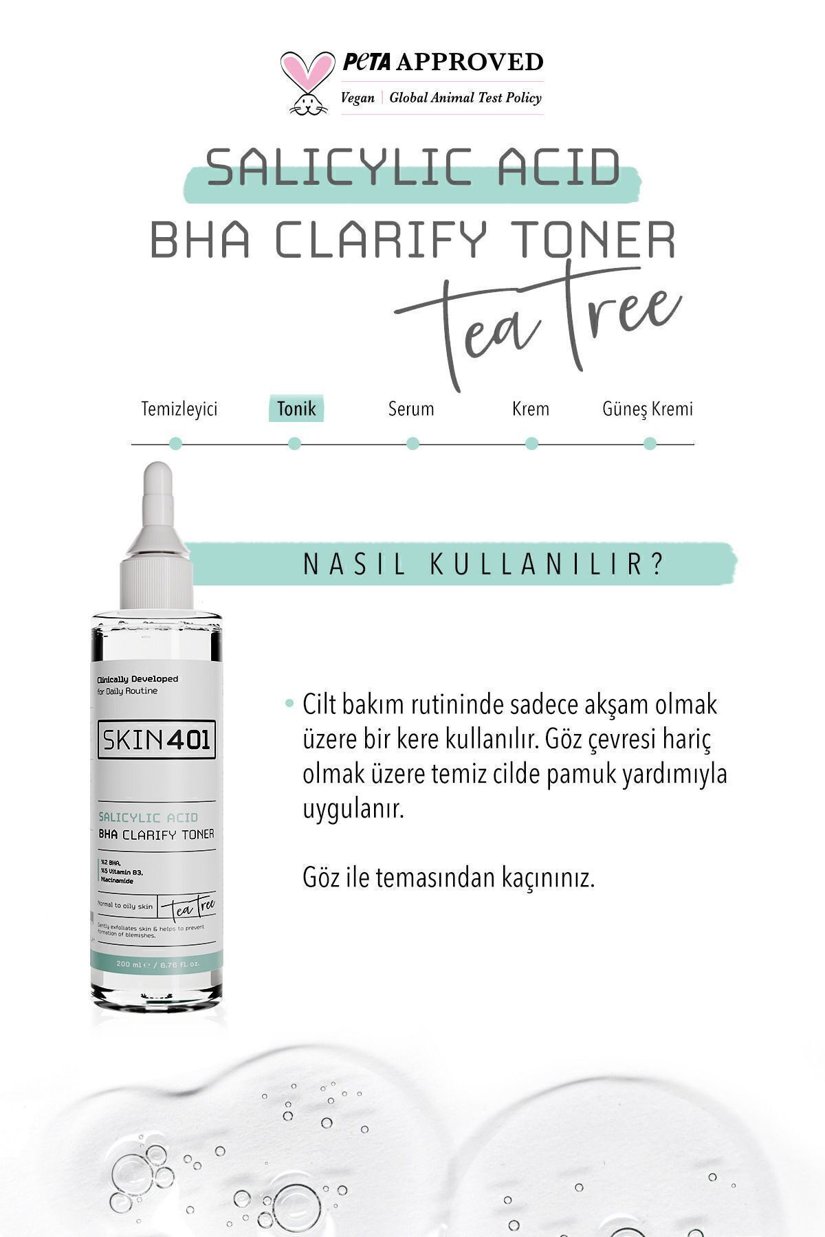 Skin401 %2 Salisilik Asit BHA Arındırıcı, Gözenek Sıkılaştırıcı Siyah Nokta Karşıtı Tonik Ne İşe Yarar? İçeriğindeki Salicylic Acid sayesinde ölü hücreleri arındırırken akne izlerini azaltmaya ve akne oluşumunu önlemeye yardımcı olur. ; Çay Ağacı sayesinde cildi yatıştırır ve gözenek görünümünü azaltır. ; Sebum dengesini korur ve cildi nemlendirir. ; Karma ve Yağlı Ciltlerin kullanımına uygundur. ; Skin401 %2 Salisilik Asit BHA Arındırıcı, Gözenek Sıkılaştırıcı Siyah Nokta Karşıtı Tonik Nasıl Kullanılır? Cilt bakım rutininde sadece akşam olmak üzere bir kere kullanılır. ; Göz çevresi hariç olmak üzere temiz cilde pamuk yardımıyla uygulanır. ; Göz ile temasından kaçınınız.;