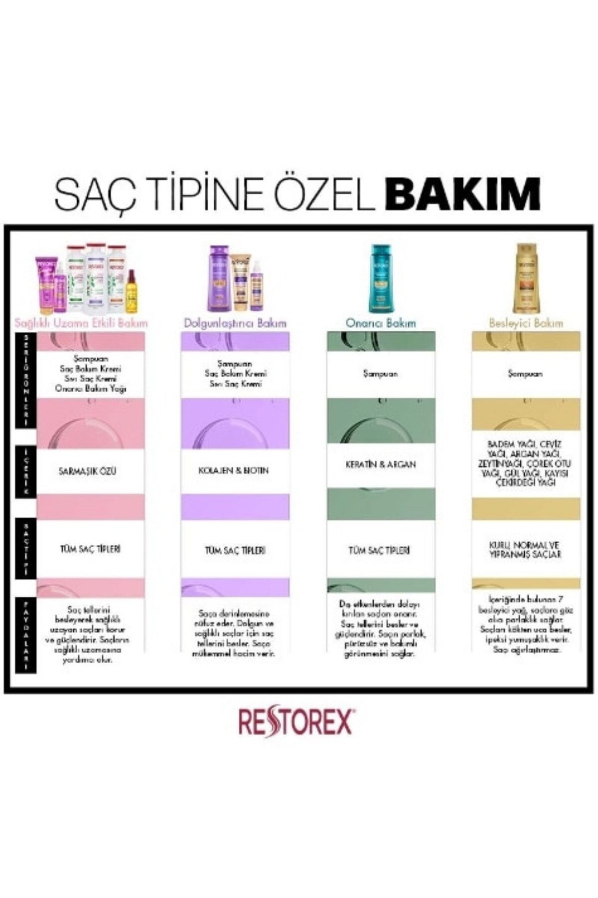 Besleyici Bakım Şampuanı ; Restorex Bakım Şampuanı 7 Besleyici Yağ 500 ml + Keratin & Argan Şampuan 500 ml olmak üzere toplamda 2 adet 500 ml şampuan gözükecektir. ; Saçlar zamanla canlılığını kaybeder ve mat bir görünüm alır. Restorex Besleyici Bakım Şampuanı içerisinde bulunan 7 besleyici yağ ile saçı ağırlaştırmadan, kökten uca besler. Argan, gül, ceviz, zeytin, kayısı, badem ve çörek otu yağı ile göz alıcı bir parlaklık sağlar. İpeksi bir yumuşaklık verir. ; 500ml ; Kırık ve İşlem Görmüş Saçlar için Onarıcı Bakım Şampuanı Keratin ve argan içeren özel formülü ile dış etkenlerden dolayı kırılan saç uçlarını onarır. Saç tellerini besler ve güçlendirir. Saçı parlak, pürüzsüz ve bakımlı bir görünüme ulaştırır. İÇİNDEKİLER AQUA/WATER, SODIUM LAURETH SULFATE, COCAMIDOPROPYL BETAINE, SODIUM CHLORIDE, GLYCERIN, PARFUM/FRAGRANCE, HYDROLYZED KERATIN, ARGANIA SPINOSA KERNEL OIL, BENZYL ALCOHOL, GLYCOL DISTEARATE, CARBOMER, DIMETHICONOL, TEA-DODECYLBENZENESULFONATE, GUAR HYDROXYPROPYLTRIMONIUM CHLORIDE, AMODIMETHICONE, COCAMIDE MEA, TETRASODIUM EDTA, POLYQUATERNIUM-7, TRIDECETH-12, CETRIMONIUM CHLORIDE, HEXYL CINNAMAL, METHYLCHLOROISOTHIAZOLINONE, METHYLISOTHIAZOLINONE, CI 42090, CI 19140. ÜRÜNÜ NASIL KULLANACAĞIM? Saçlarınızı ıslattıktan sonra uygulayınız, köpürtünüz ve sonrasında durulayınız. Gerekli ise tekrar ediniz. Sık kullanıma uygundur. Daha sağlıklı uzama etkisi için Restorex saç bakım ürünleri ile birlikte kullanınız. GÖZLERE TEMAS HALİNDE BOL SU İLE DURULANMALIDIR. Formülündeki keratin ve argan ile saçın nemlendirilmesine katkı sağlar. Hasarlı saçların onarılmasına destek olur. Saçın pürüzsüz ve sağlıklı görünmesini sağlar.8