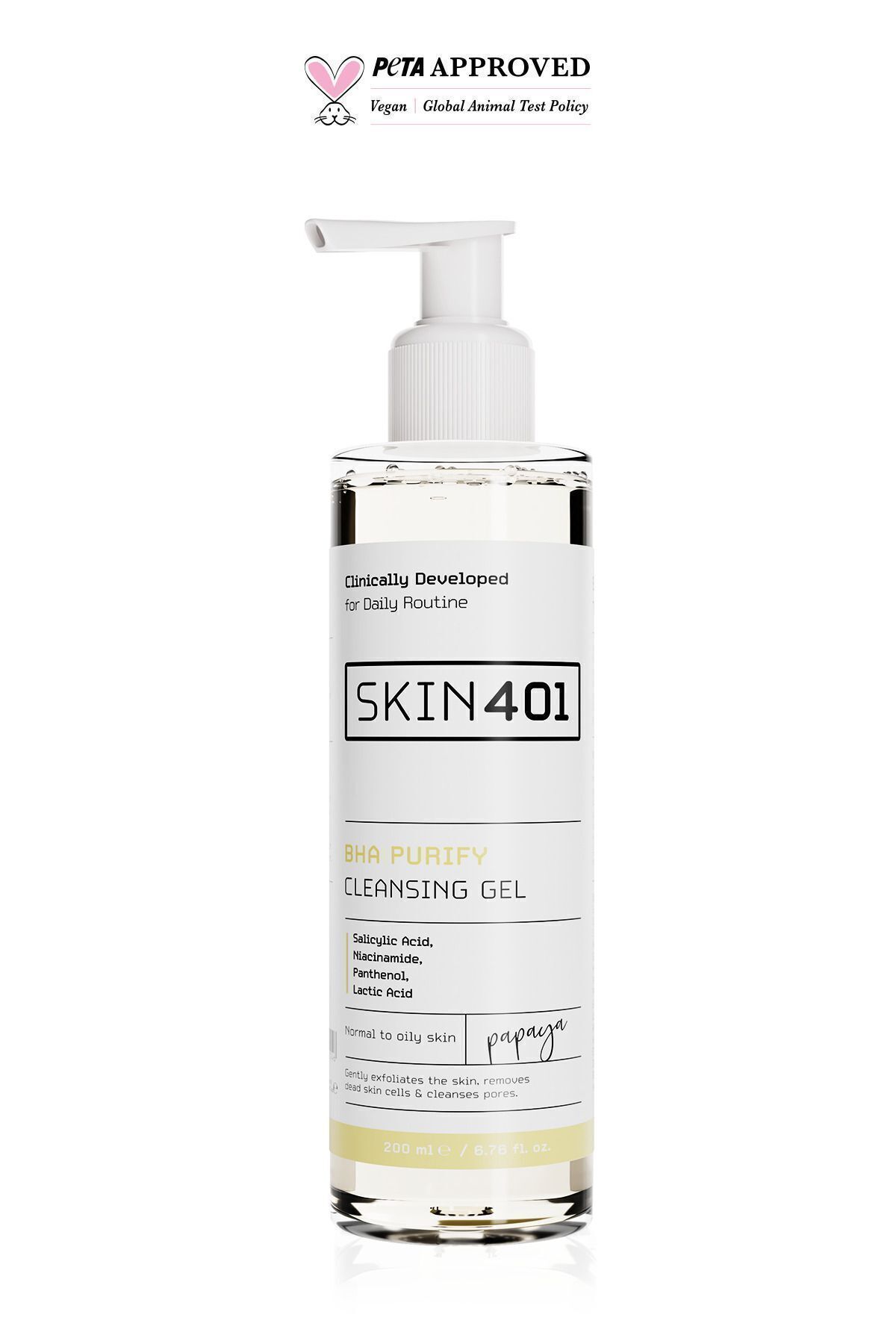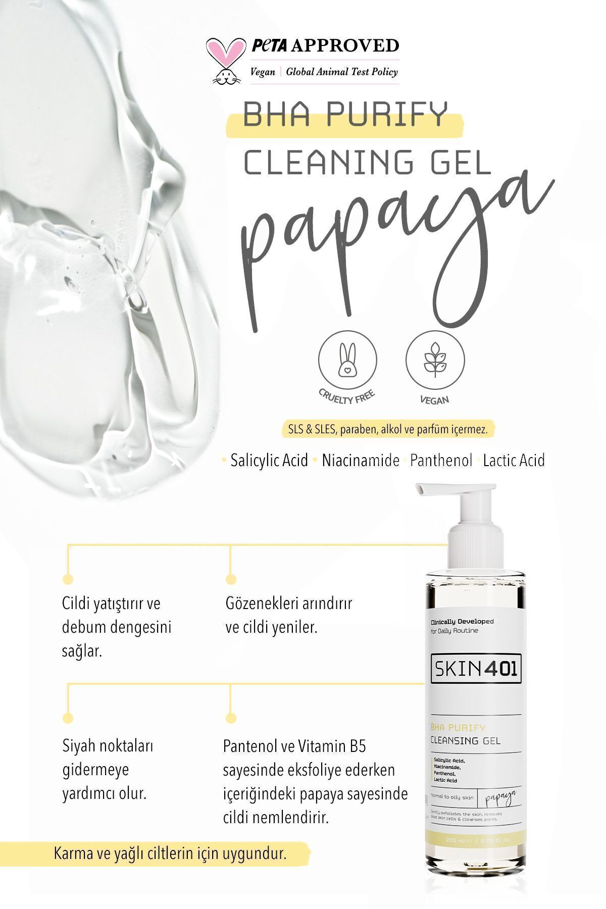 Skin401 BHA Purify Cleansing Gel 200ml Ürün Açıklaması:İçeriğindeki Salicylic Acid ve Niacinamide Acid cildi yenileyip gözenekleriarındırır. Panthenol sayesinde cildiyatıştırırken, Cadı Fındığı sayesinde sebum dengesini sağlar. Akneyi,sivilceleri ve siyah noktaları gidermeye yardımcı olur. Cildi nemlendirir; günboyu ışıltılı, canlı ve aydınlık bir cilt görünümü sağlar. Karma ve Yağlı Ciltlerinkullanımına uygundur. Nasıl Kullanılır?Cilt bakım rutininde sabah ve akşam olmak üzere 2 kere kullanılabilir.Göz çevresi hariç olmak üzere nemli cilde yeterli miktarda ürün daireselhareketlerle masaj yaparak uygulanır. Ardından bol su ile durulanır. Ingredients: Aqua, Disodium Laureth Sulfosuccinate, Lauryl Glucoside, SodiumC14-16 Olefin Sulfonate, Cocamidopropyl Betaine, Glycerin, Salicylic Acid,Niacinamide, PEG-7 Glyceryl Cocoate, Propylene Glycol, CaricaPapaya Fruit Extract, Hamamelis Virginiana LeafWater, Camellia Sinensis Leaf Extract, Allantoin, Panthenol, SodiumHyaluronate, Sorbitol, CitricAcid, PEG-120 Methyl Glucose Dioleate, Tetrasodium Glutamate Diacetate,Phenoxyethanol, Benzoic Acid, Dehydroacetic Acid, Lactid Acid, Tetrasodium EDTA,Ethylhexylglycerin.