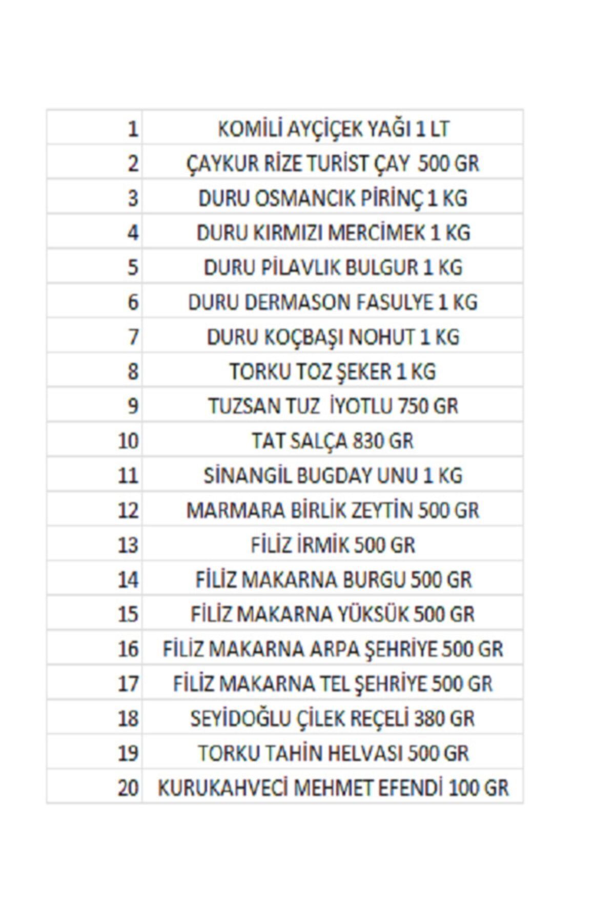 1 BİRYAĞ AYÇİÇEK YAĞI 1 LT 2 ÇAYKUR RİZE TURİST ÇAY 500 GR 3 DURU OSMANCIK PİRİNÇ 1 KG 4 DURU KIRMIZI MERCİMEK 1 KG 5 DURU PİLAVLIK BULGUR 1 KG 6 DURU DERMASON FASULYE 1 KG 7 DURU KOÇBAŞI NOHUT 1 KG 8 TORKU TOZ ŞEKER 1 KG 9 TUZSAN TUZ İYOTLU 750 GR 10 TAT SALÇA 830 GR 11 SİNANGİL BUGDAY UNU 1 KG 12 MARMARA BİRLİK ZEYTİN 500 GR 13 FİLİZ İRMİK 500 GR 14 FİLİZ MAKARNA BURGU 500 GR 15 FİLİZ MAKARNA YÜKSÜK 500 GR 16 FİLİZ MAKARNA ARPA ŞEHRİYE 500 GR 17 FİLİZ MAKARNA TEL ŞEHRİYE 500 GR 18 SEYİDOĞLU ÇİLEK REÇELİ 380 GR 19 TORKU TAHİN HELVASI 500 GR 20 KURUKAHVECİ MEHMET EFENDİ 100 GR