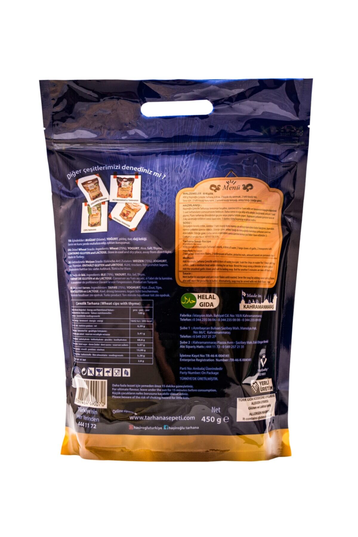 Çerezlik Tarhana 450 Gr ; İçindekiler: Buğday(Dövme), Yoğurt, Pirinç, Tuz, Dağ Kekiği ; Dövme 1/2 Yoğurt ; Tüketim Şekli: Atıştırmalık cips olarak veya Maraş usulü tarhana çorbası olarak tüketilebilir.; ; KUZEYİN TEDARİKÇİSİ FARKIYLA STOKTAKİ ÜRÜN, HIZLI GÖNDERİM, GÜVENİLİR ADRES.; ; Protein Kaynağı :15 g ; Lif Kaynağı :5,3g ; Enerji ve Besin Değeri –Energy and Nutritional Values- Durchschnittliche Nährwerte – Valeurs nutritionnelles moyennes – Gemiddelde voedingswaarde ; pro – per – par ; 100 g ; Enerji – Energy - Brennwert – énergie - Energi ; 1642 kJ/393kcal ; Yağ– Fat - Fett- Matières Graisses - Vet ; 6,39 g ; Doymuş Yağ – Saturated Fat - Davon gesättigte Fettsäuren – dont acides gras saturé – waarvan verzadigde vetzuren ; 3,41 g ; Karbonhidrat – Carbohydrate - Kohlenhydrate – glucides - koolhydraten ; 68,8 g ; Toplam Şeker – Total Sugar - Davon Zucker – dont sucres – waarvan suikers ; 5,07 g ; Protein – Protein - Eiweiß – Protéines - Eiwitten ; 15 g ; Lif - dietary fiber - ballaststoffe - fibre alimentaire - vodingsvezels ; 5,28 g ; Tuz – Salt - Salz - Sel - Zout ; 2,8 g ;