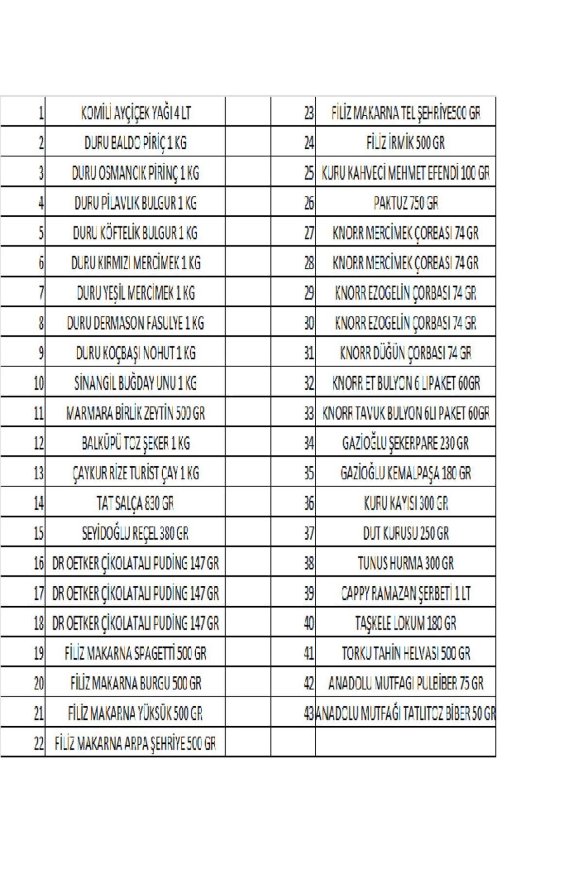 1 KOMİLİ AYÇİÇEK YAĞI 4 LT 23 FİLİZ MAKARNA TEL ŞEHRİYE500 GR 2 DURU BALDO PİRİÇ 1 KG 24 FİLİZ İRMİK 500 GR 3 DURU OSMANCIK PİRİNÇ 1 KG 25 KURU KAHVECİ MEHMET EFENDİ 100 GR 4 DURU PİLAVLIK BULGUR 1 KG 26 PAKTUZ 750 GR 5 DURU KÖFTELİK BULGUR 1 KG 27 KNORR MERCİMEK ÇORBASI 74 GR 6 DURU KIRMIZI MERCİMEK 1 KG 28 KNORR MERCİMEK ÇORBASI 74 GR 7 DURU YEŞİL MERCİMEK 1 KG 29 KNORR EZOGELİN ÇORBASI 74 GR 8 DURU DERMASON FASULYE 1 KG 30 KNORR EZOGELİN ÇORBASI 74 GR 9 DURU KOÇBAŞI NOHUT 1 KG 31 KNORR DÜĞÜN ÇORBASI 74 GR 10 SİNANGİL BUĞDAY UNU 1 KG 32 KNORR ET BULYON 6 LIPAKET 60GR 11 MARMARA BİRLİK ZEYTİN 500 GR 33 KNORR TAVUK BULYON 6LI PAKET 60GR 12 BALKÜPÜ TOZ ŞEKER 1 KG 34 GAZİOĞLU ŞEKERPARE 230 GR 13 ÇAYKUR RİZE TURİST ÇAY 1 KG 35 GAZİOĞLU KEMALPAŞA 180 GR 14 TAT SALÇA 830 GR 36 KURU KAYISI 300 GR 15 SEYİDOĞLU REÇEL 380 GR 37 DUT KURUSU 250 GR 16 DR OETKER ÇİKOLATALI PUDİNG 147 GR 38 TUNUS HURMA 300 GR 17 DR OETKER ÇİKOLATALI PUDİNG 147 GR 39 CAPPY RAMAZAN ŞERBETİ 1 LT 18 DR OETKER ÇİKOLATALI PUDİNG 147 GR 40 TAŞKELE LOKUM 180 GR 19 FİLİZ MAKARNA SPAGETTİ 500 GR 41 TORKU TAHİN HELVASI 500 GR 20 FİLİZ MAKARNA BURGU 500 GR 42 ANADOLU MUTFAGI PULBİBER 75 GR 21 FİLİZ MAKARNA YÜKSÜK 500 GR 43 ANADOLU MUTFAĞI TATLITOZ BİBER 50 GR 22 FİLİZ MAKARNA ARPA ŞEHRİYE 500 GR;