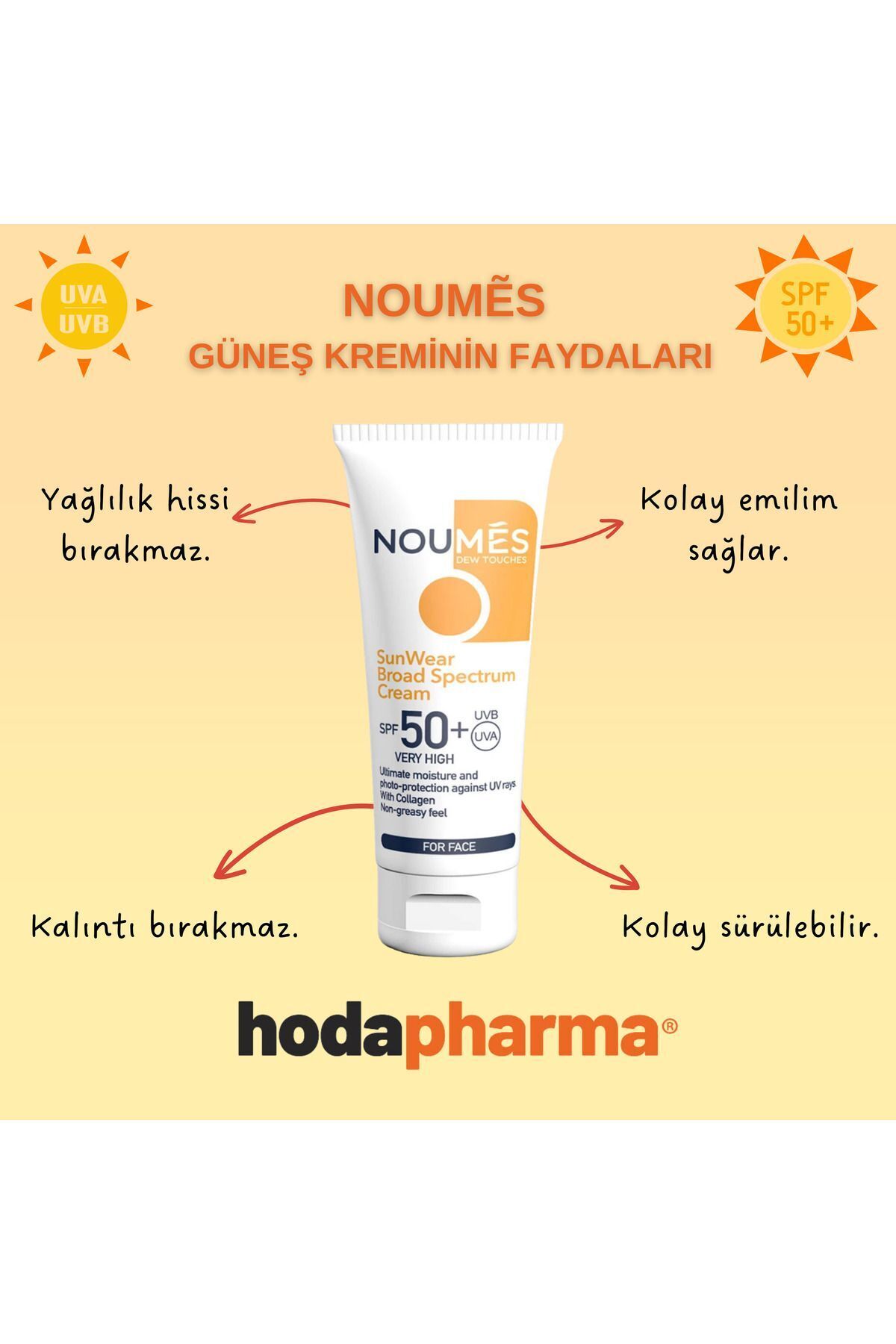Noumes SunWear SPF 50+ antipigmentasyon güneş kremi UVB veUVA ışınlarına karşı yüksek koruma sağlayan ve geniş spektrumlu filtreleriçeren yeni nesil bir cilt bakım ürünüdür; İçeriğinde güneş ışınlarındankoruyan filtrelerin yanında bitkisel kökenli leke karşıtı lumiskin ve arbutin, cildinemlendiren aktifler, cildi besleyen bitkisel yağlar ve özler bulunmaktadır; Lumiskin, UV kaynaklı melanin sentezini ve kahverengilekeleri azaltmak için melanogenez sürecini etkileyen bitki türevi moleküldür; Yağdaçözünen bir aktif olan Lumiskin cildi aydınlatmaya, cilt berraklığınıiyileştirmeye ve cilt tonunu eşitlemeye yardımcı olurken cilt renkbozukluklarını gidermeyi destekler; Arbutin ciltteki doğal pigment olan melanin ile reaksiyonagirerek leke oluşumunu engelleyen, cilt tonunun eşitlenmesine yardımcı olancilt parlatıcı bir maddedir; Kızarıklık, güneş, yaşlılık ve akne lekeleri karşıoldukça etkilidir; Yüksek emilim özelliği sayesinde cildinizde beyaz birkalıntı ve yağlı bir his bırakmaz, ağırlık hissi vermez; Güneşe çıkmadan en az20; 30 dakika önce uygulanması tavsiye edilir; 4 mevsim kullanılabilir; Makyajbazı olarak kullanılabilir; Hassas ciltler dahil tüm cilt tipleri içinuygundur; İçindekiler: Aqua, Glyceryl Stearate, Peg; 100 Stearate,Cetearyl Alcohol, Caprylic/Capric Triglyceride, C12; 15 Alkyl Benzoate,Ethylhexyl Methoxycinnamate, Butyl Methoxydibenzoylmethane, Titanium Dioxide,Dimethicone, Cyclopentasiloxane, Butyrospermum Parkii Butter, Niacinamide,Glycerin, Panthenol, Diacetyl Boldine, Alpha –Arbutin, Phenoxyethanol,Ethylhexylglycerin, Propylene Glycol, Simmondsia Chinensis Seed Oil, SodiumPca, Glycine Soja Protein, Sodium Hyaluronate, Saccharide Isomerate, AloeBarbadensis Leaf Juice, Pisum Sativum Extract, Punica Granatum Seed Extract,Prunus Armeniaca Kernel Oil, Prunus Amygdalus Dulcis Oil, Fragrance, XanthanGum, Disodium Edta, Carbomer, Sodium Hydroxide, Hexyl Cinnamal, Alpha IsomethylIonone;