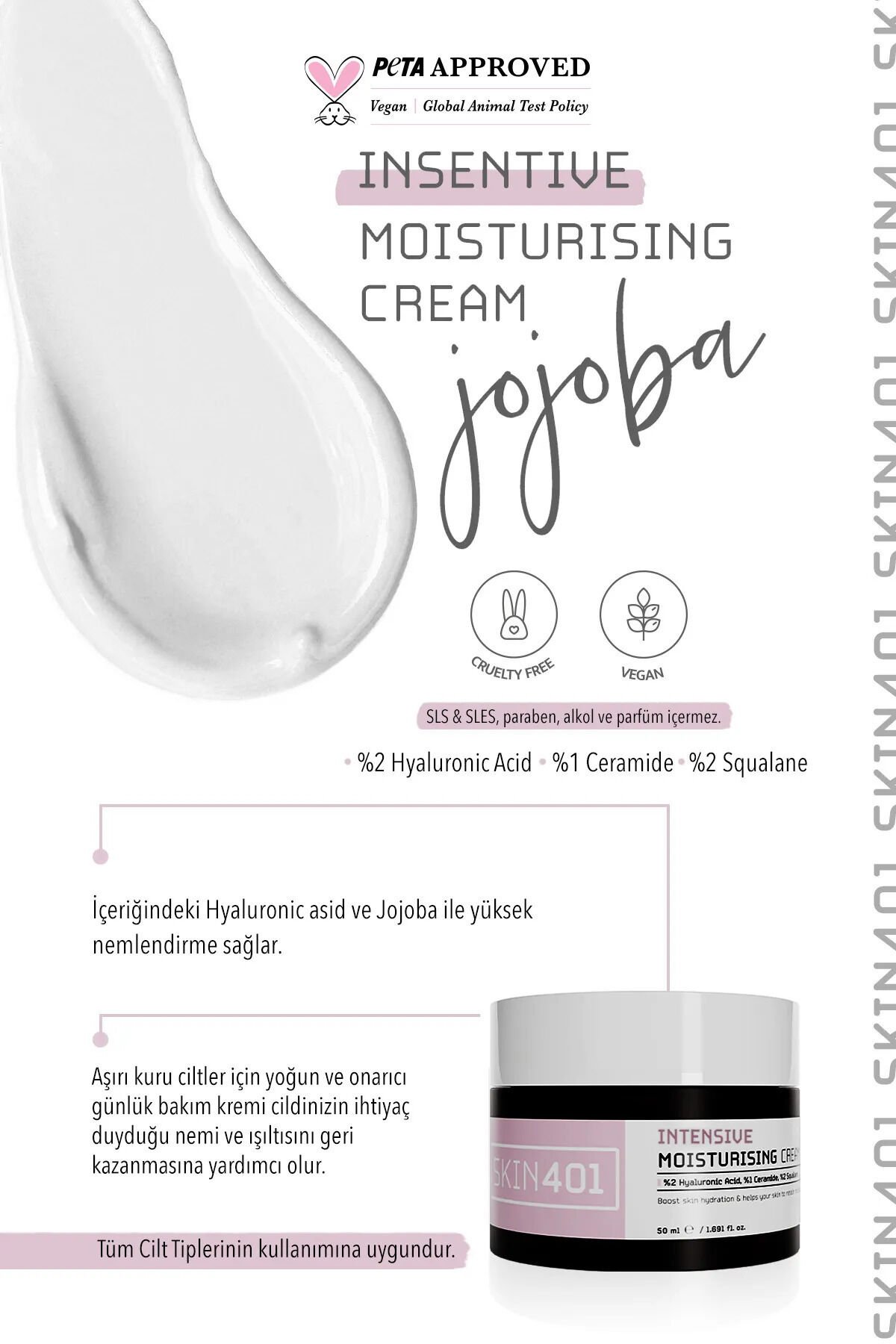 Skin401 Yogun Nemlendirici Bariyer Güçlendirici Onarıcı Bakım Kremi Ne İşe Yarar? Aşırı kuru ciltler için yoğun ve onarıcı günlük bakım kremi cildinizin ihtiyaç duyduğu nemi ve ışıltısını geri kazanmasına yardımcı olur. ; İçeriğindeki Hyaluronic asid ve Jojoba ile yüksek nemlendirme sağlar. ; Skin401 Yogun Nemlendirici Bariyer Güçlendirici Onarıcı Bakım Kremi Nasıl Kullanılır? Cilt bakım rutininizde temizlenmiş cilde sabah ve akşam olmak üzere nazikçe masaj yaparak uygulanır. ; Göz ile temasından kaçınınız. ; Tüm Cilt Tiplerinin kullanımına uygundur;